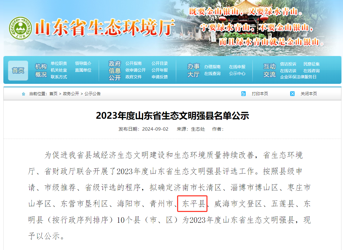 近日,由北京中環瑞德環境工程技術有限公司(以下簡稱中環瑞德)承接的東平縣人民政府2023年度山東省生態文明強縣的申報項目順利通過山東省生態環境廳和山東省財務廳篩選評估,成功入選2023年度山東省生態文明強縣,實現泰安市在“生態文明強縣”稱號上零的突破,并獲得1000萬元的專項資金。